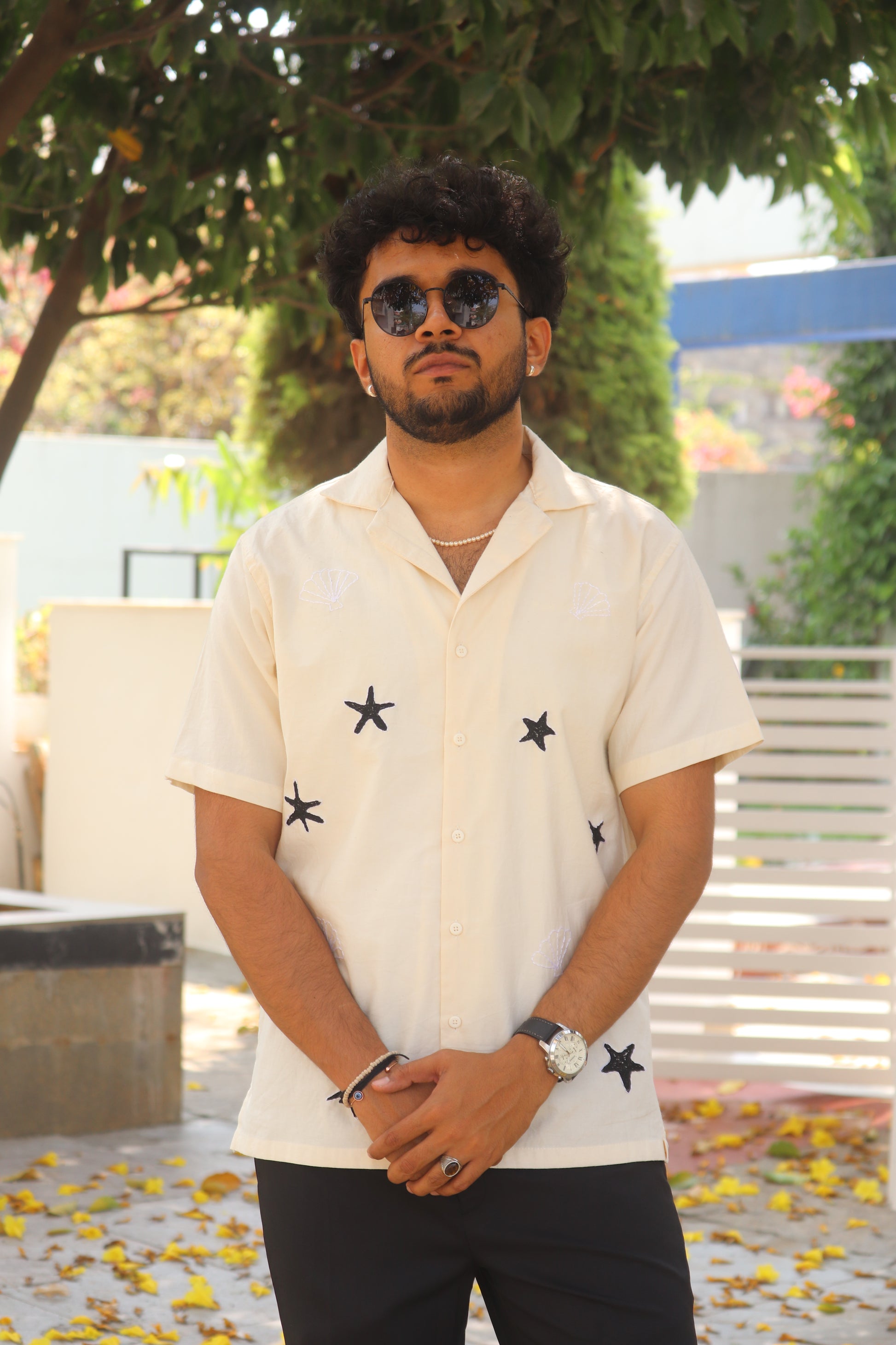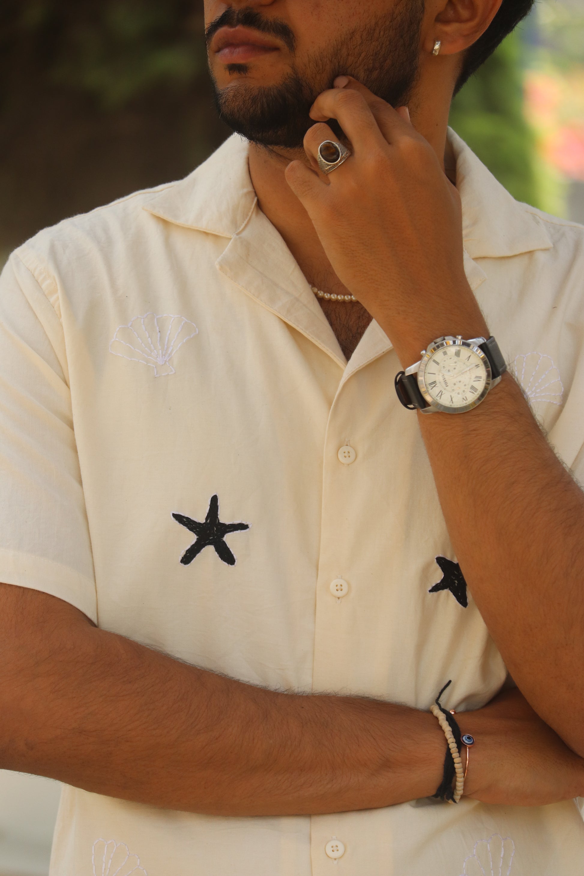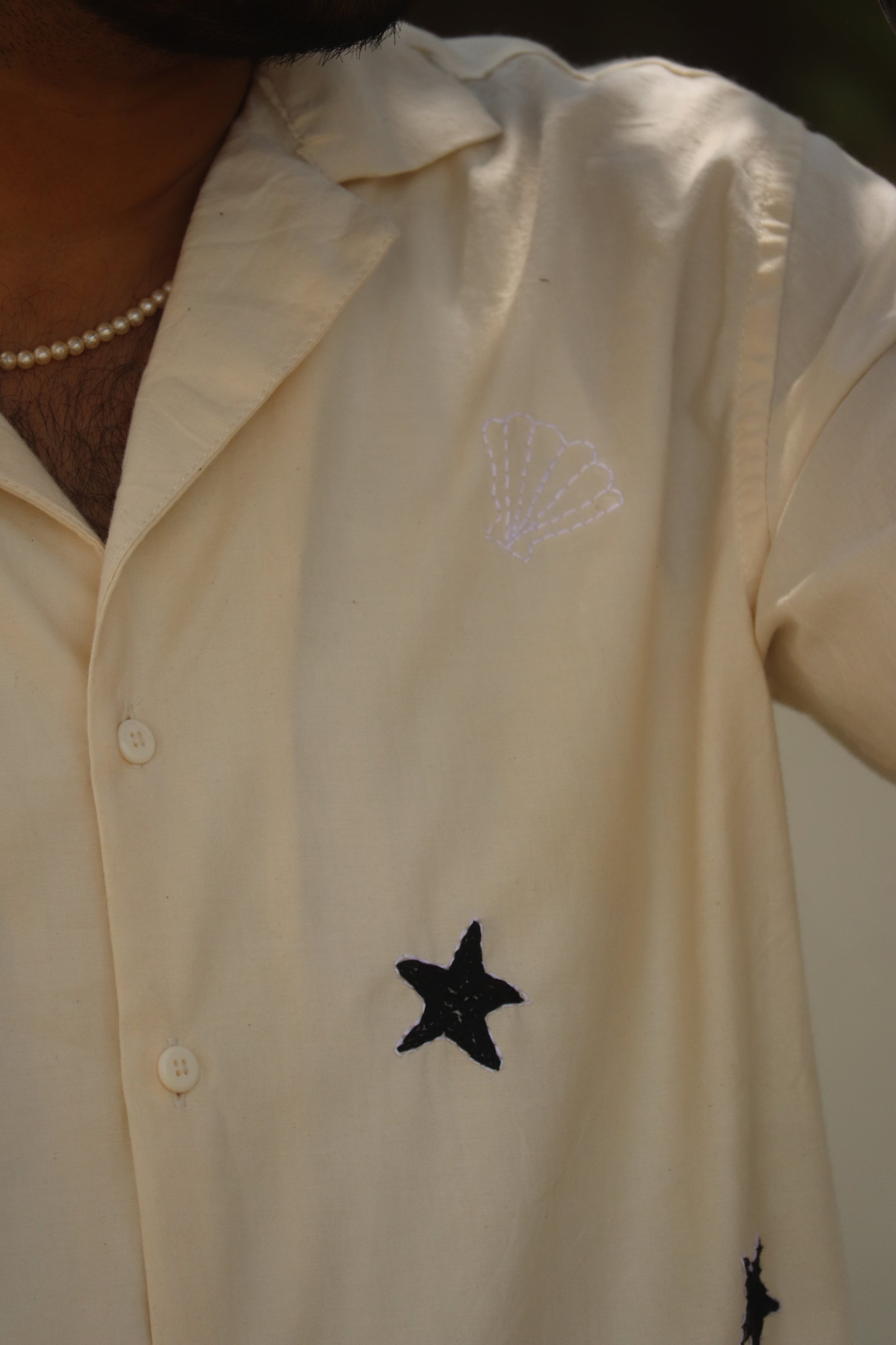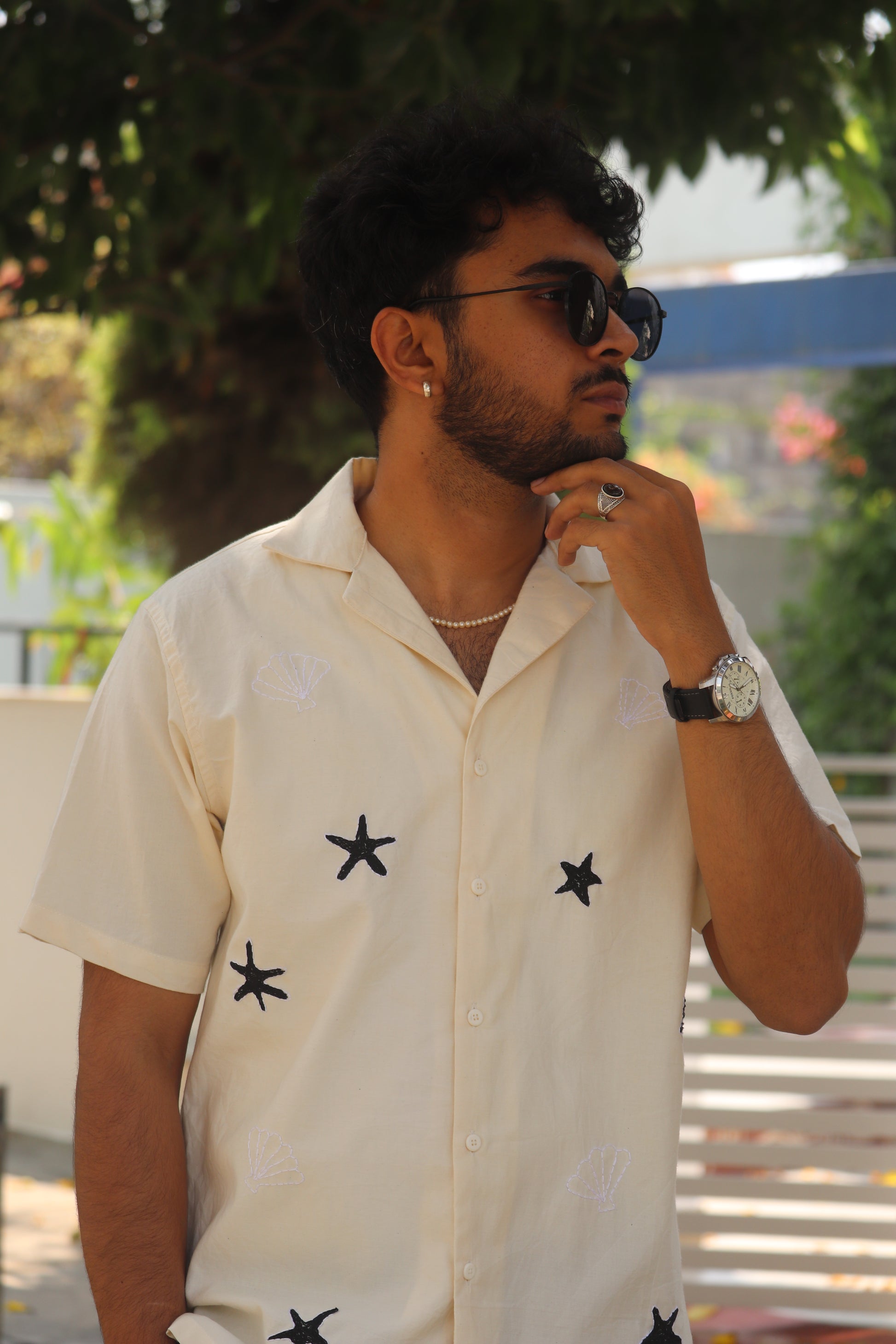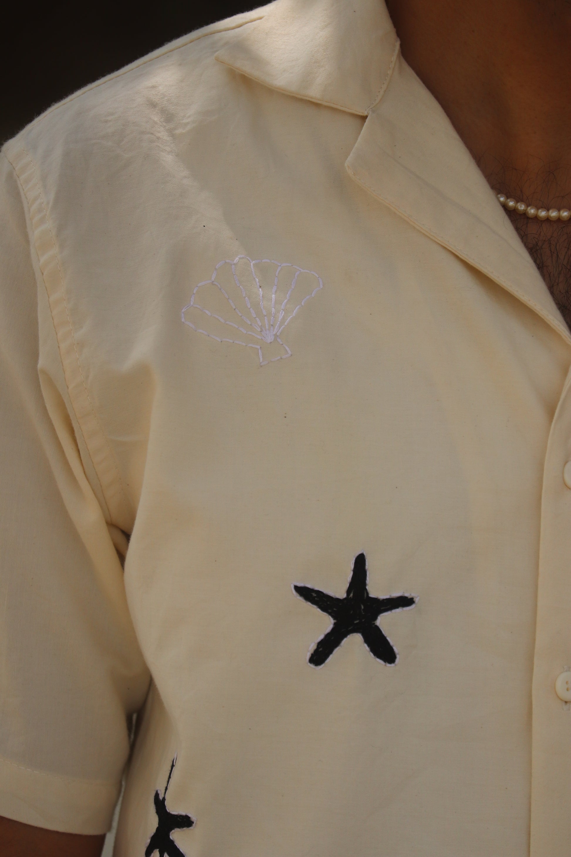 Designed with a relaxed silhouette, this short sleeve shirt features a notch collar and delicate hand embroidery of slow summer days and sea salt moods. Hand embroided star fish and shell motifs are scattered across the front placed thoughtfully, far apart never overwhelming.