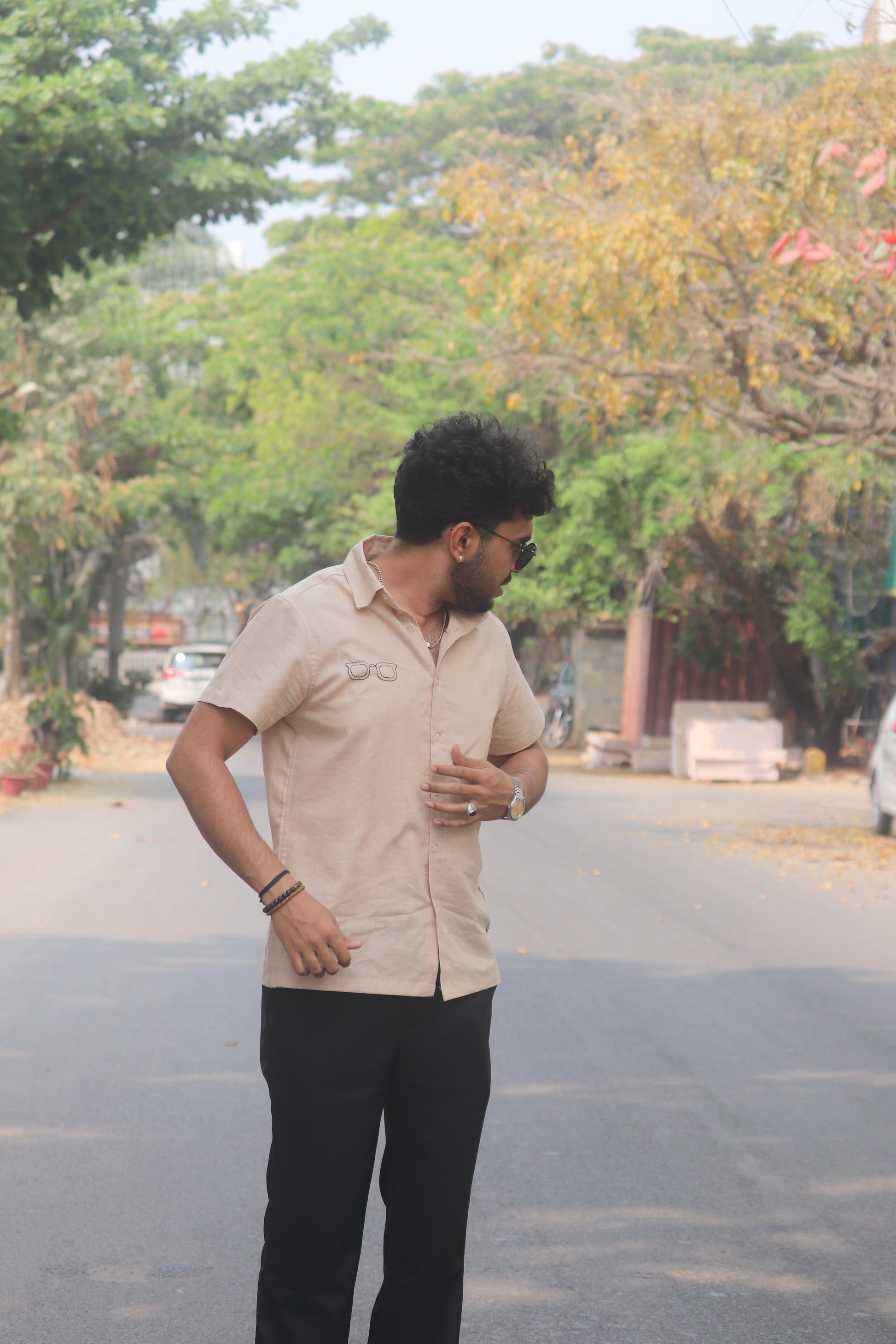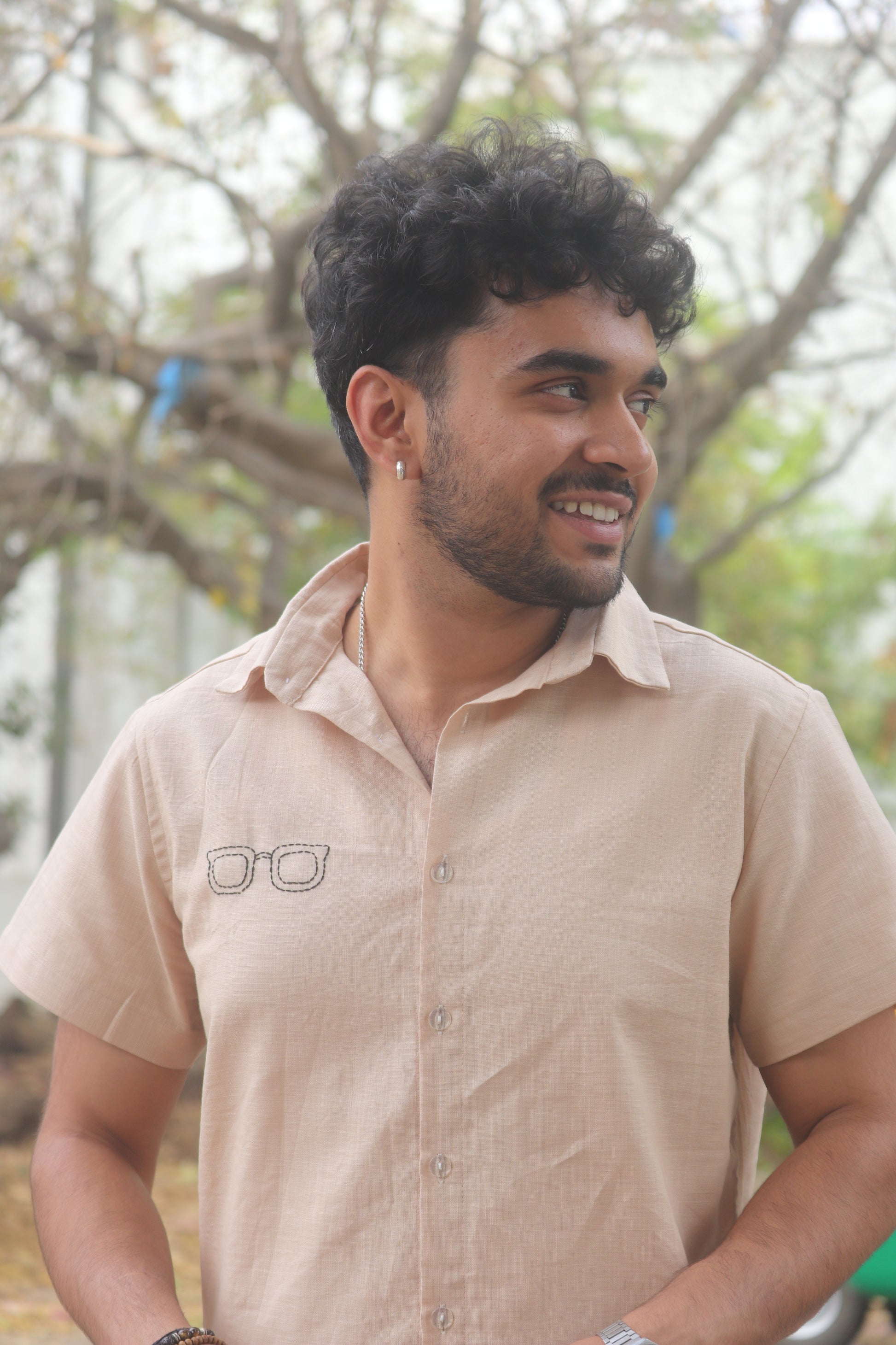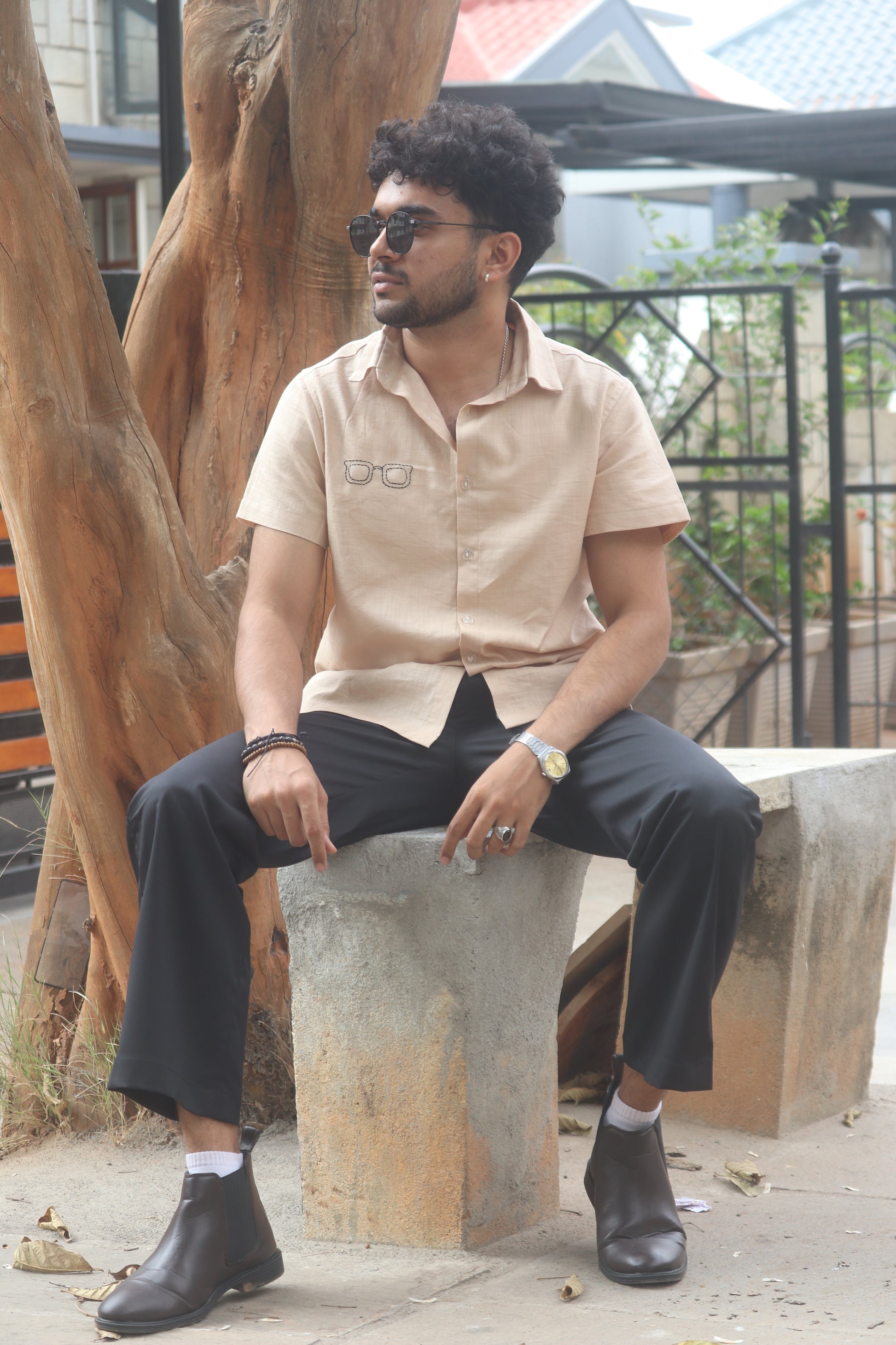 Crafted from breathable linen- cotton fabric, The Off Duty Shade Shirt is Designed for effortless everyday wear. Featuring hand embroided sunglasses on the chest and subtle detailing along the side, this piece blends minimal design with playful character.